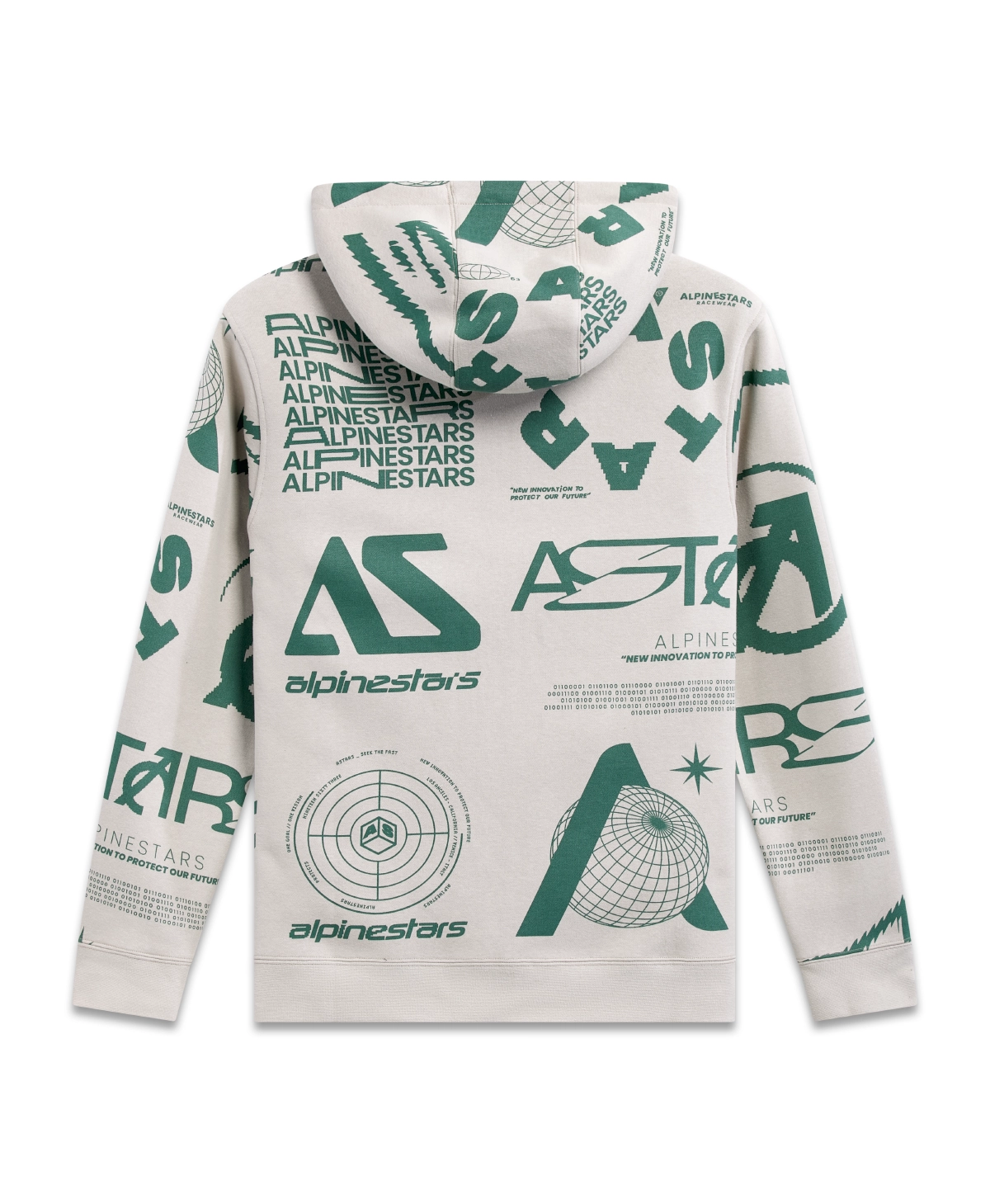 • ZIP FRONT FLEECE HOODIE • Zip front hoodie with kangaroo pocket • All-over multi-logo print. Crop logo patch at left chest • Self lined hood, dipped drawcord tips, rib cuffs and hem • Internal main label and external label branding.