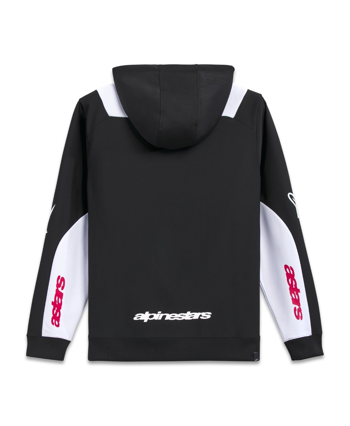• Hooded zip front poly fleece • Zip front hoodie with Alpinestars DNA styling Mesh lined hood, tech drawcords, rib cuffs and hem • Large chest logo, elbow logos, forearm Astars word and back wordmark prints • Internal main label and external label branding.