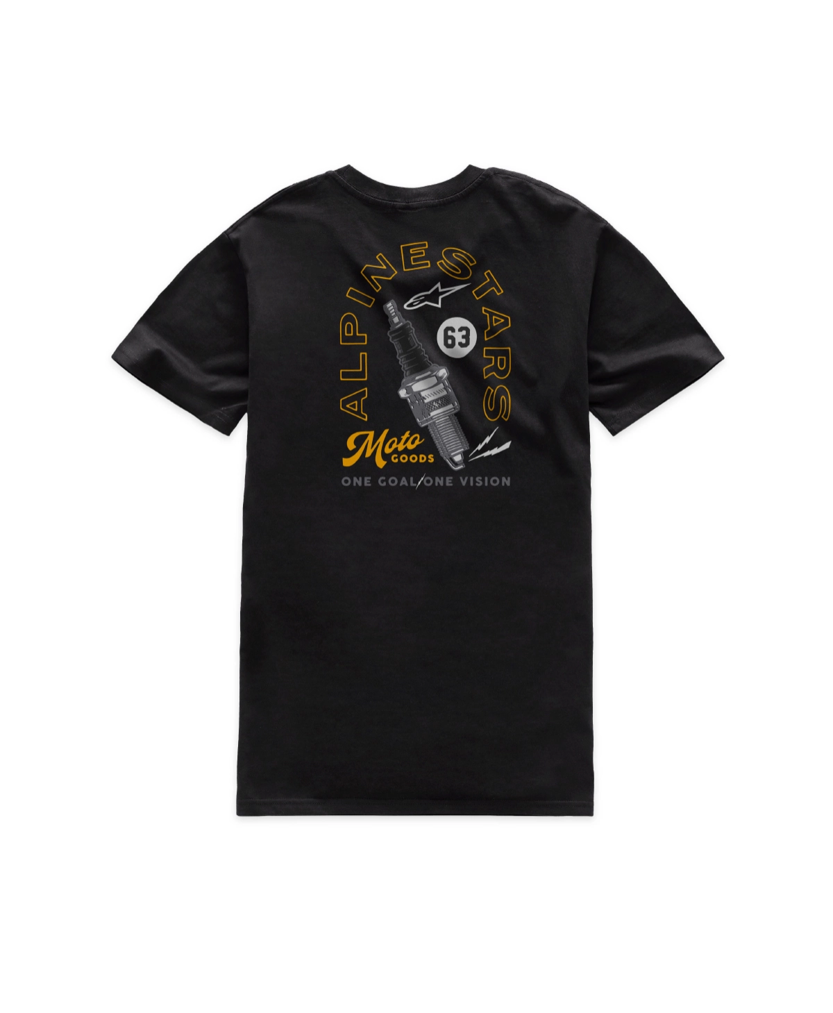 • Printed Cut and Sew Fit Tee • Front logo graphic. • Large back spark plug graphic. Soft hand print • Internal neck print, external labeling.