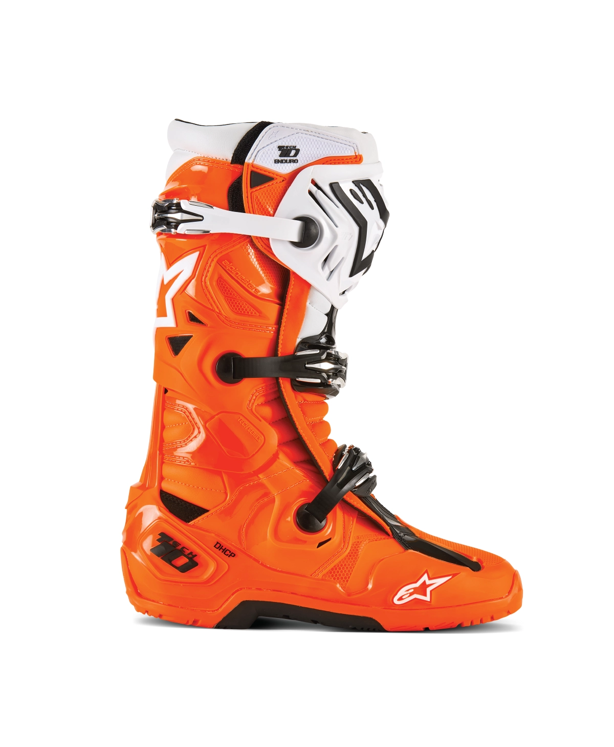 • The Tech 10 Enduro is equipped with Alpinestars ankle control system, which is integrated in the outer shell to allow natural ankle movement, vertical compression control and improved flex control and impact resistance. This is complemented by inner ankle brace and the unique heel protection innovation; the patented Dynamic Heel Compression Protector (DCHP). This significantly reduces the effect of excessive, potentially injury-causing, energy being transferred to the ankle and lower leg.